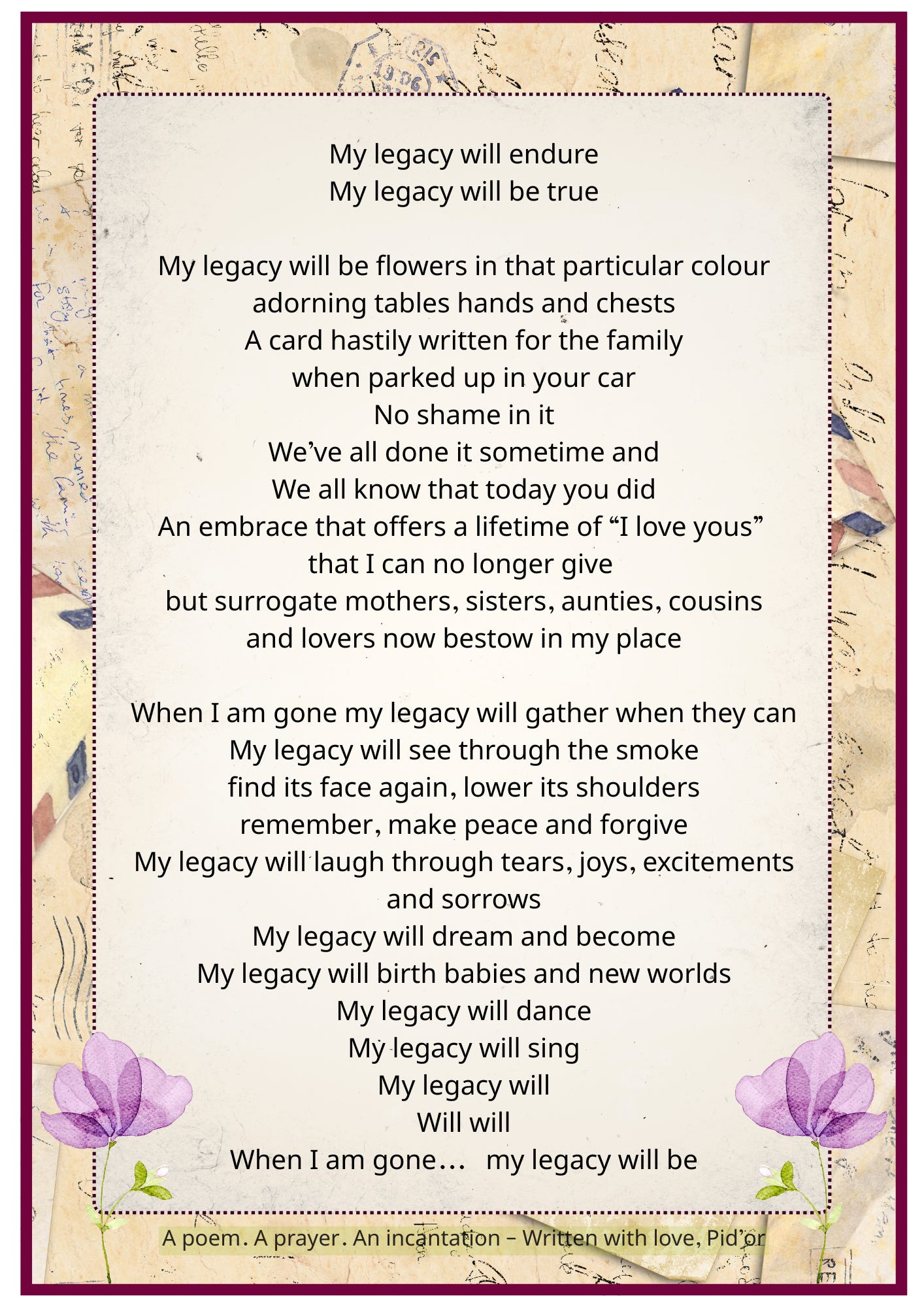 Playback speed×Share postShare post at current timeShare from 0:000:00/0:00Transcript241Testament & WillA memorial poem for a beloved mother | 10 years on...Pid'or TampaMay 21, 2025241ShareTranscriptSubscribeYour interactions and recommendations encourage me to keep writing and sharing my pen-play. Leave a commentI love connecting with other writers & readers. Introduce me to your network!ShareIf you’d like to support my work further consider one of the options below:Brain fuel: Treat me to cake & teaInspiration & Education: Add a book to my shelfNetwork & Peer support: Let's connect on InstagramThanking you kindly for walking this journey with me.SubscribeDiscussion about this videoCommentsRestacksPTPlays WriterSubscribeAuthorsPid'or Tampa